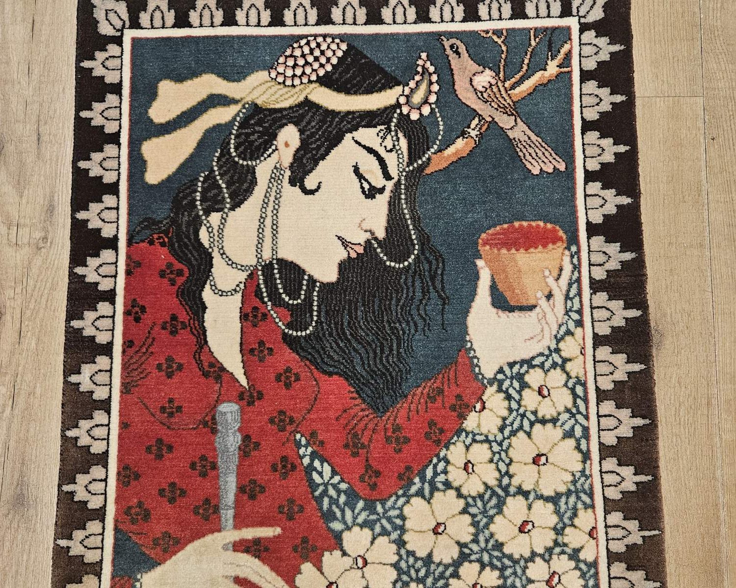 Het kleed is prachtig van kleur en fijngeknoopt.