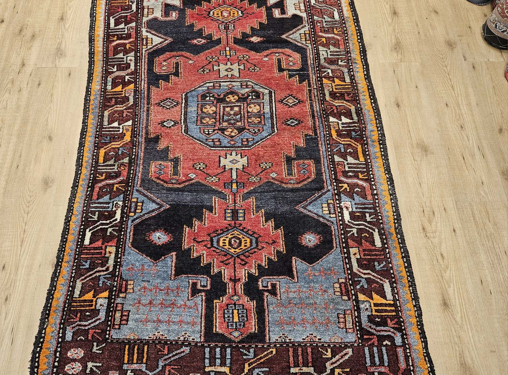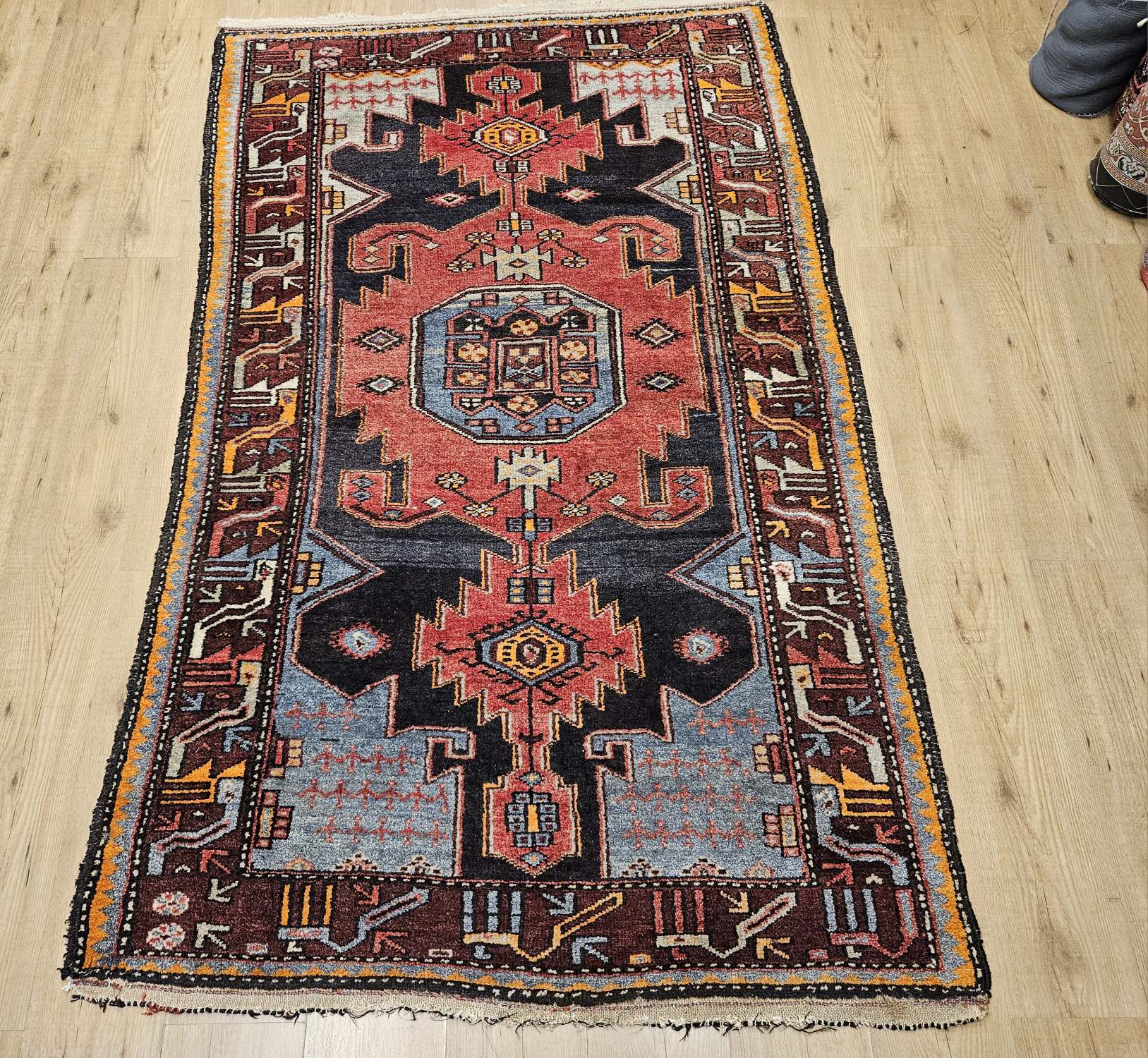 het kleed is prachtig van kleur en heeft mooie geometrische patronen.