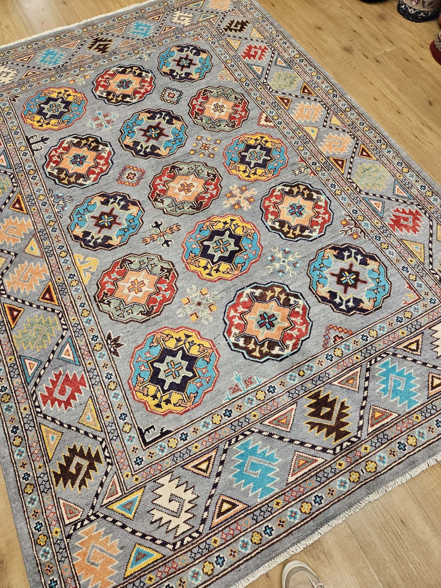 Het kleed is prachtig van kleur en heeft mooie geometrische patronen.