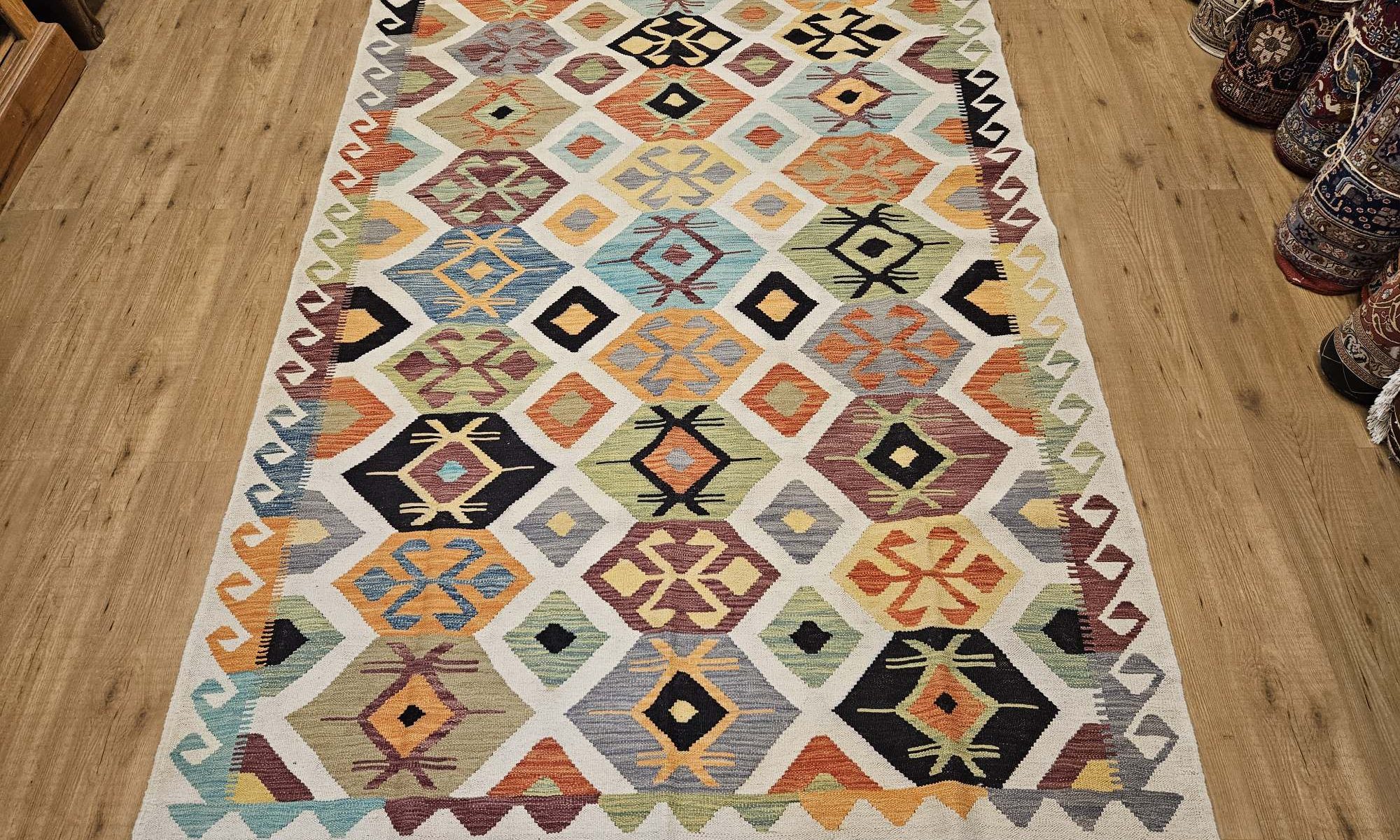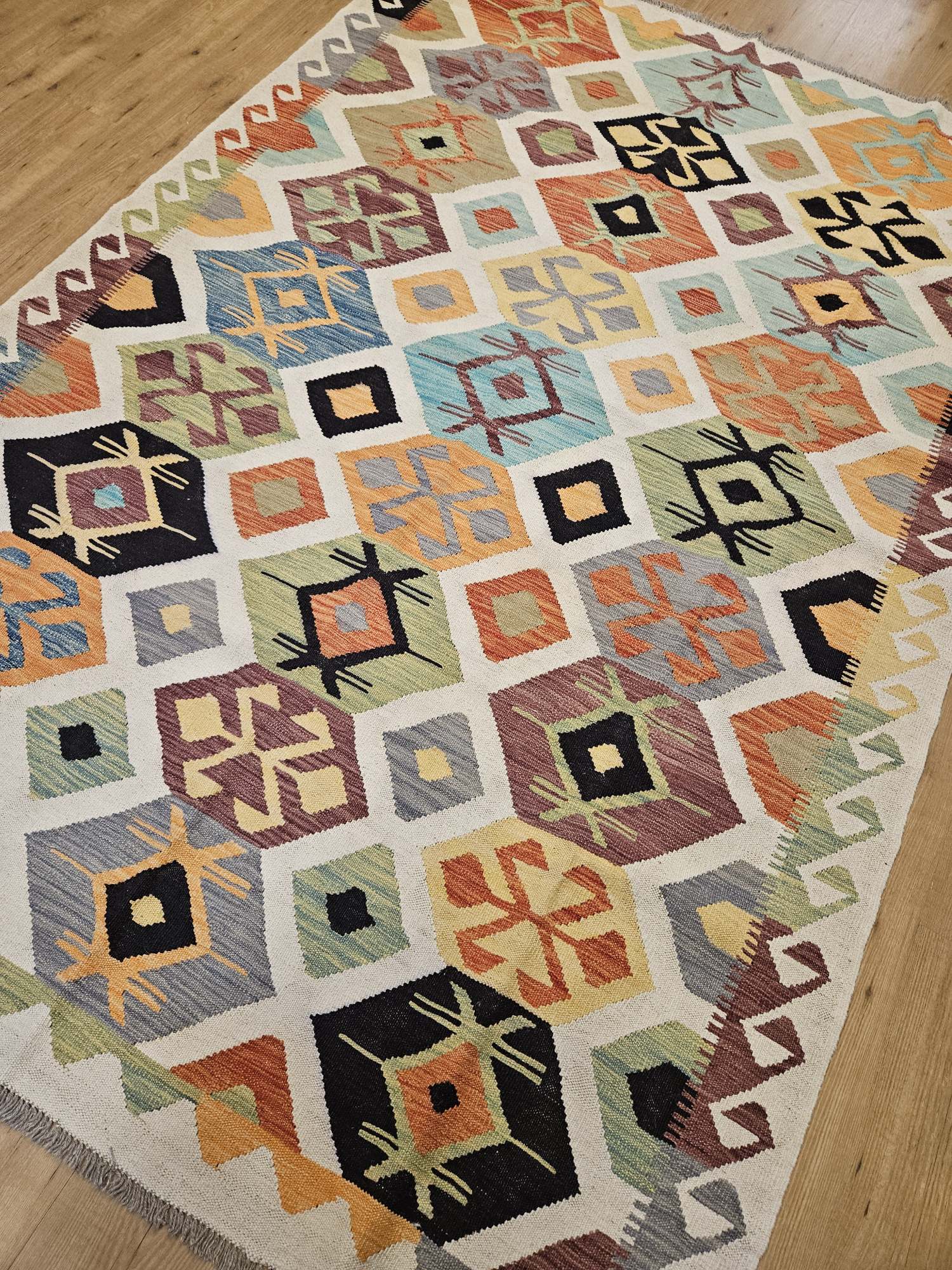 Het kleed is prachtig van kleur en heeft mooie geometrische patronen.