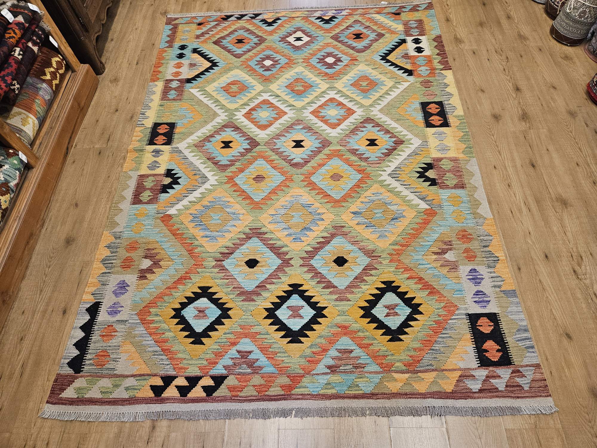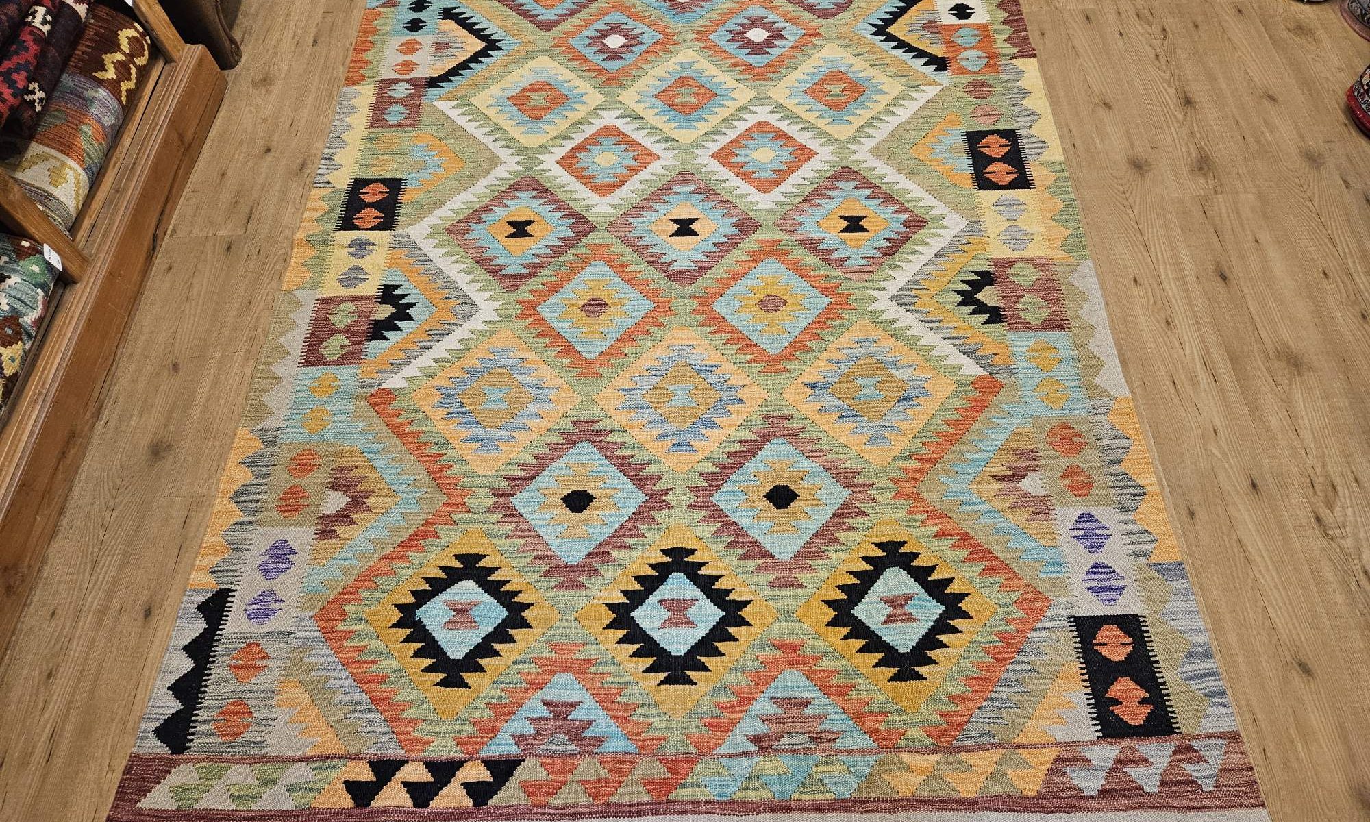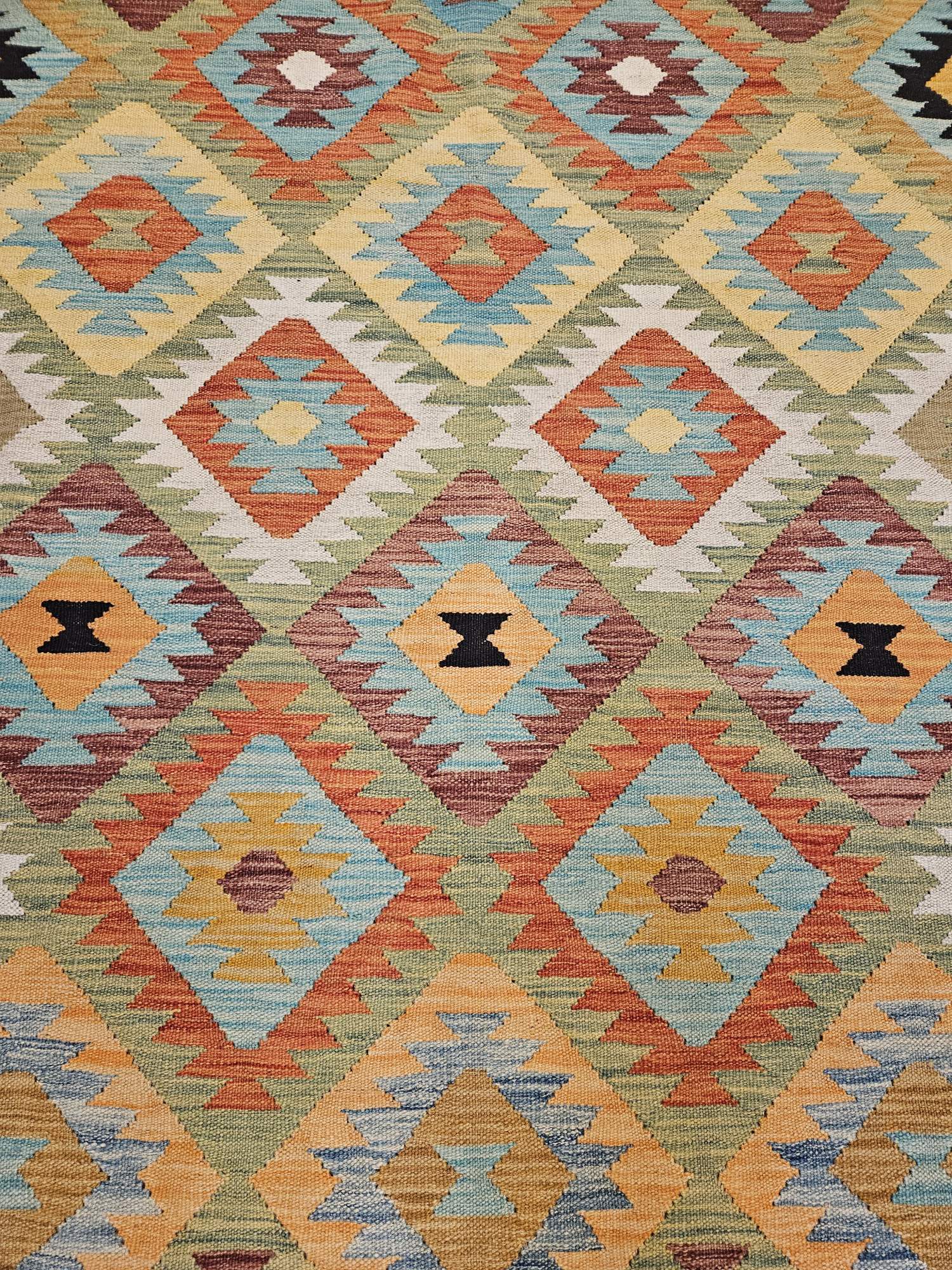 Het kleed is prachtig van kleur en heeft mooie geometrische patronen
