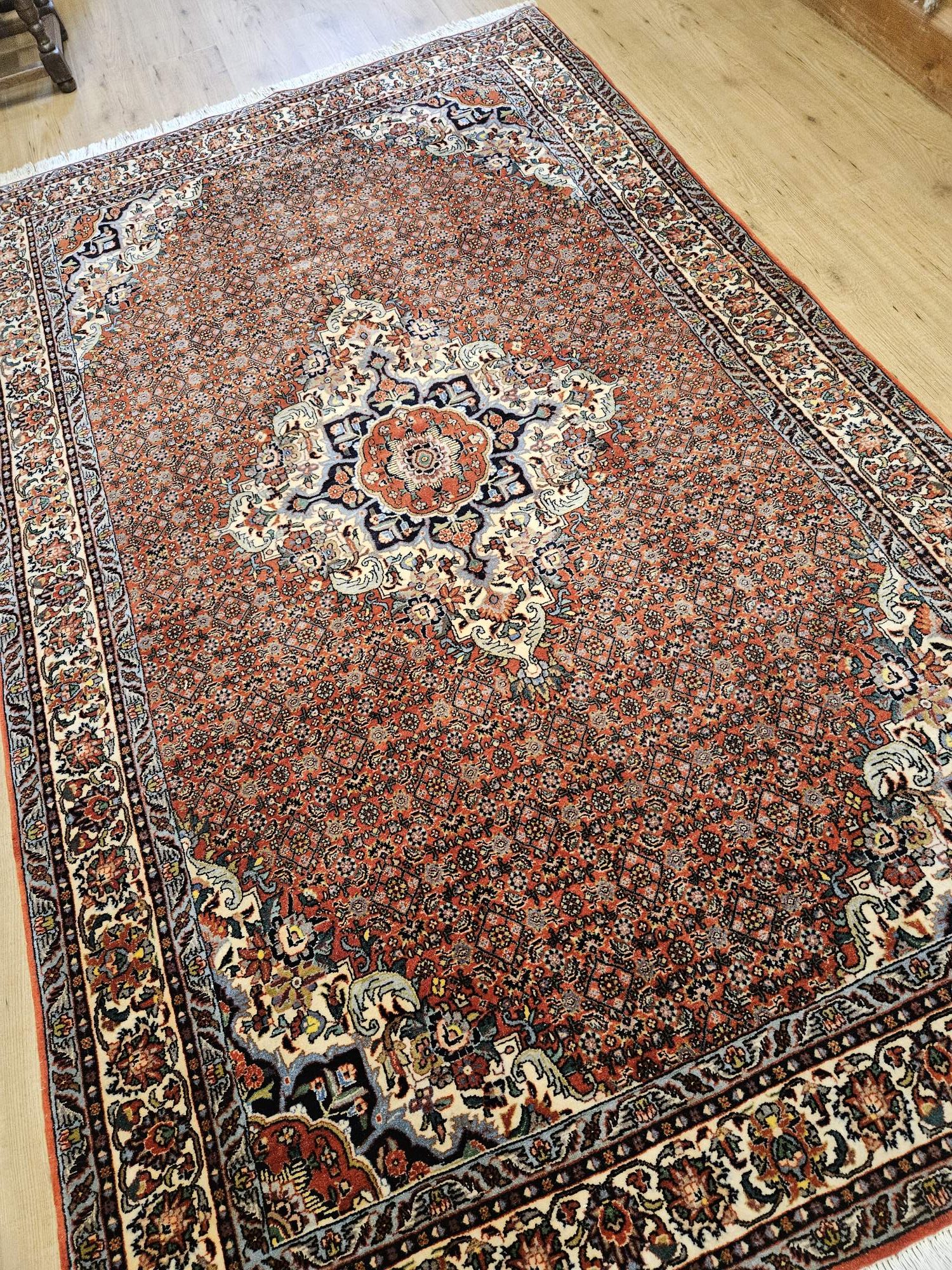 Het kleed is prachtig van kleur en fijngeknoopt.