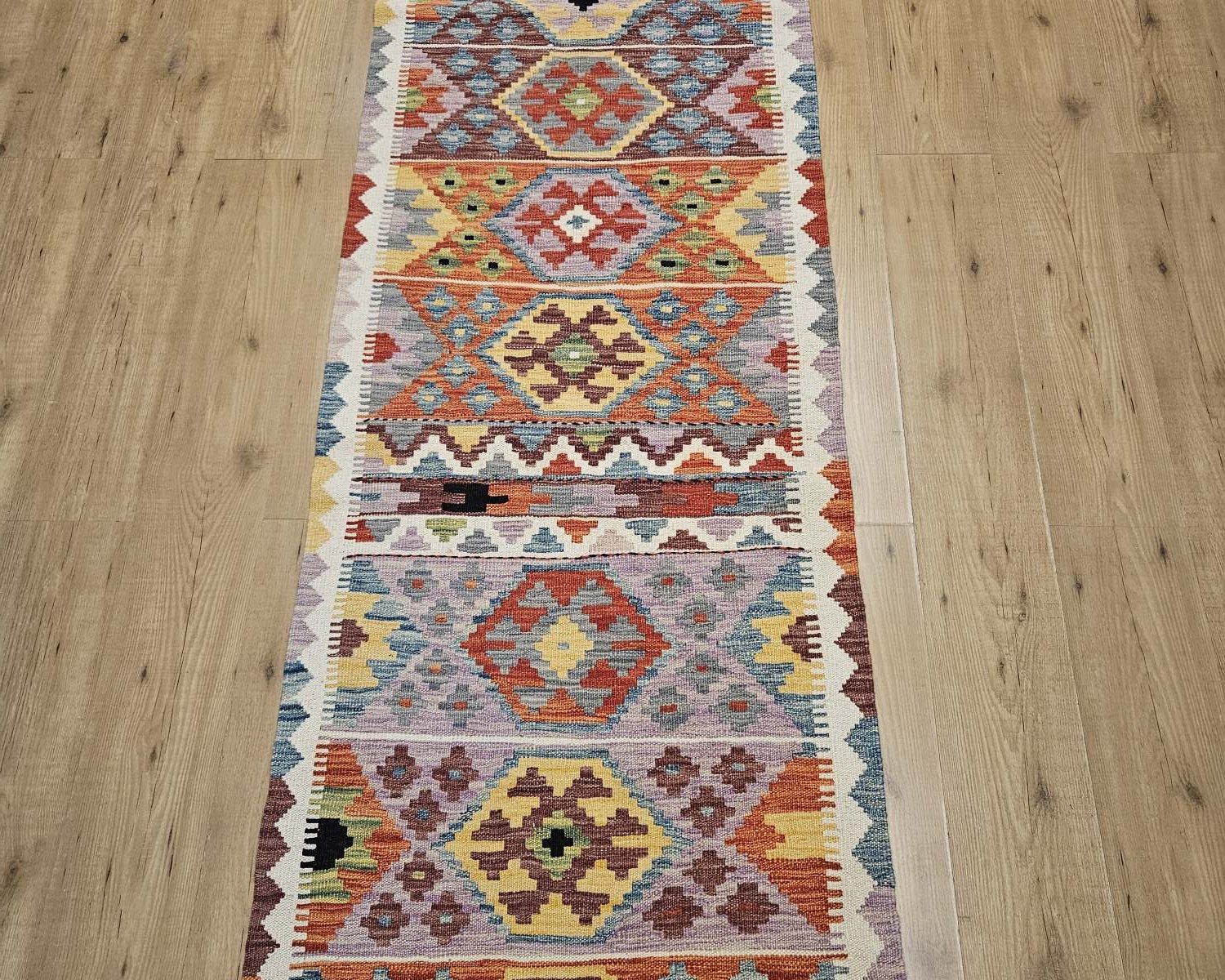 Het kleed is prachtig van kleur en heeft mooie geometrische patronen.