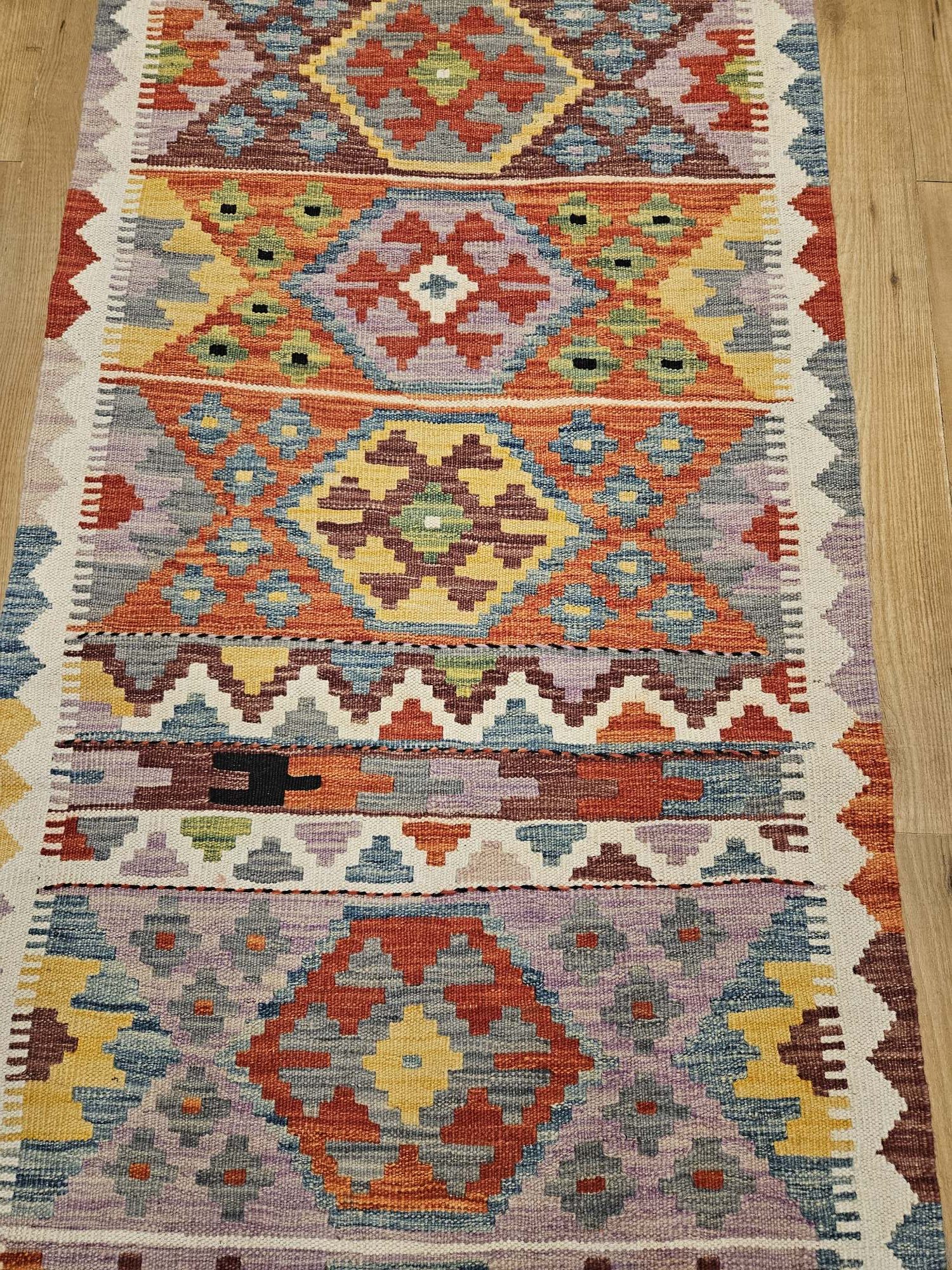 Het kleed is prachtig van kleur en heeft mooie geometrische patronen.