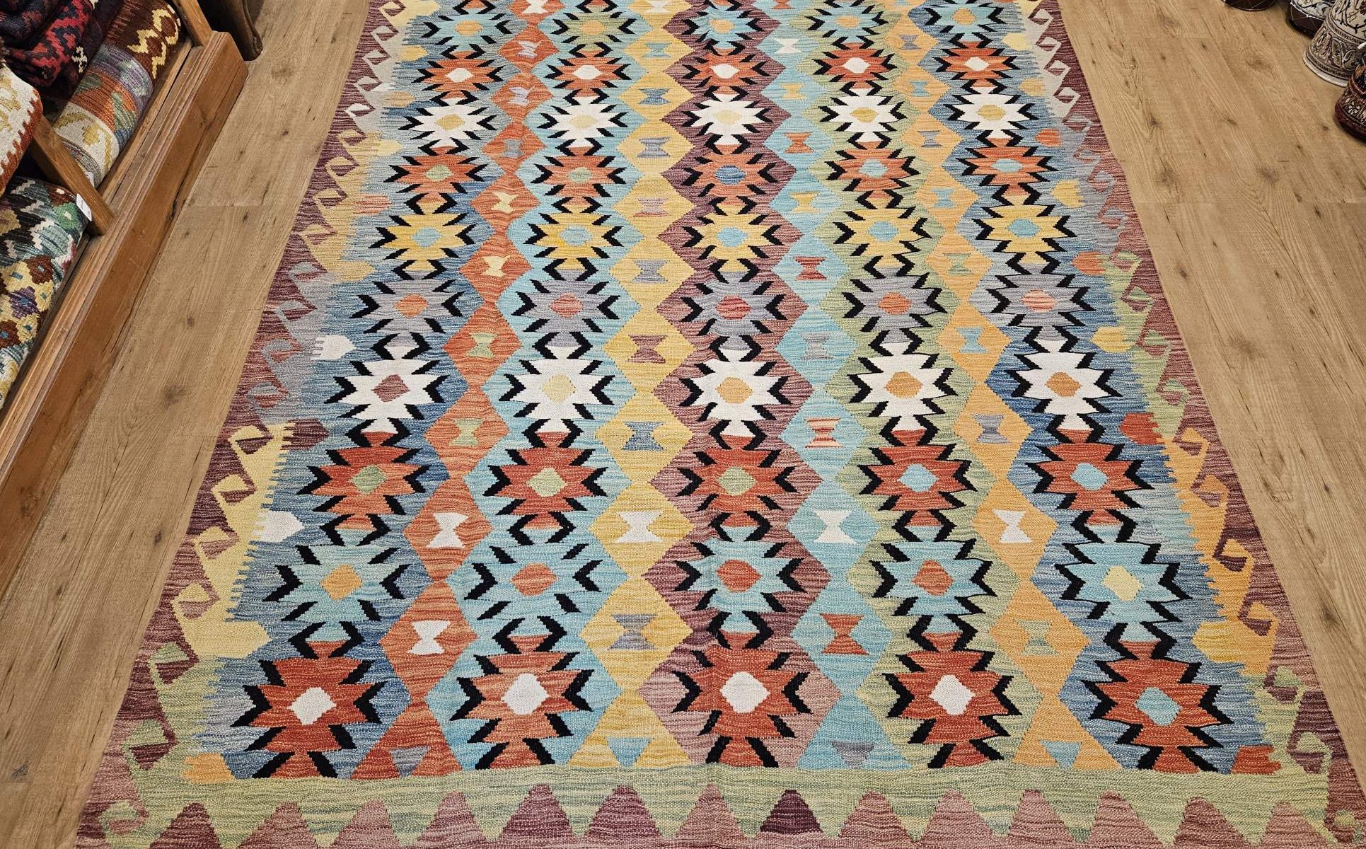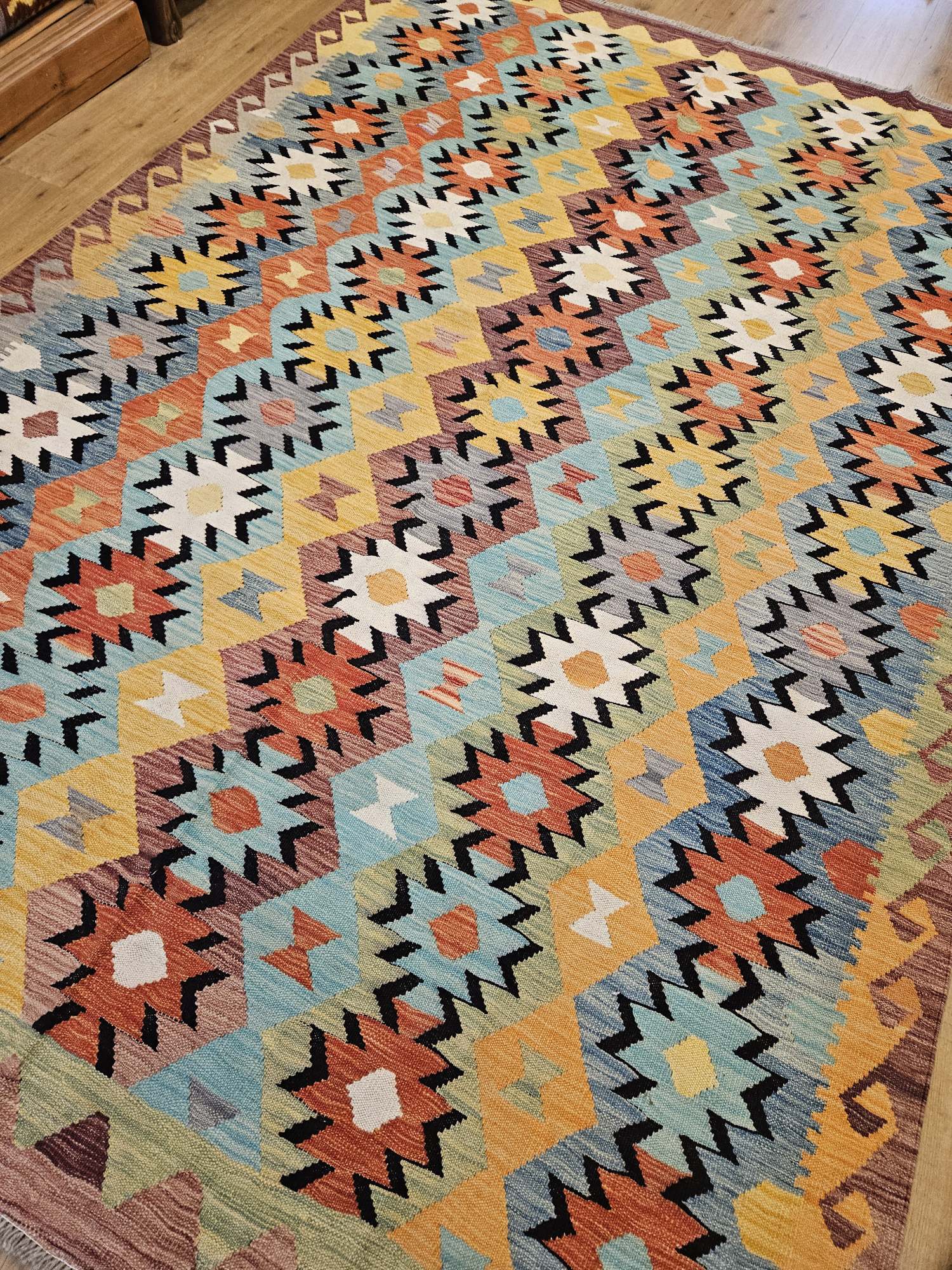 Het kleed is prachtig van kleur en heeft mooie geometrische patronen.