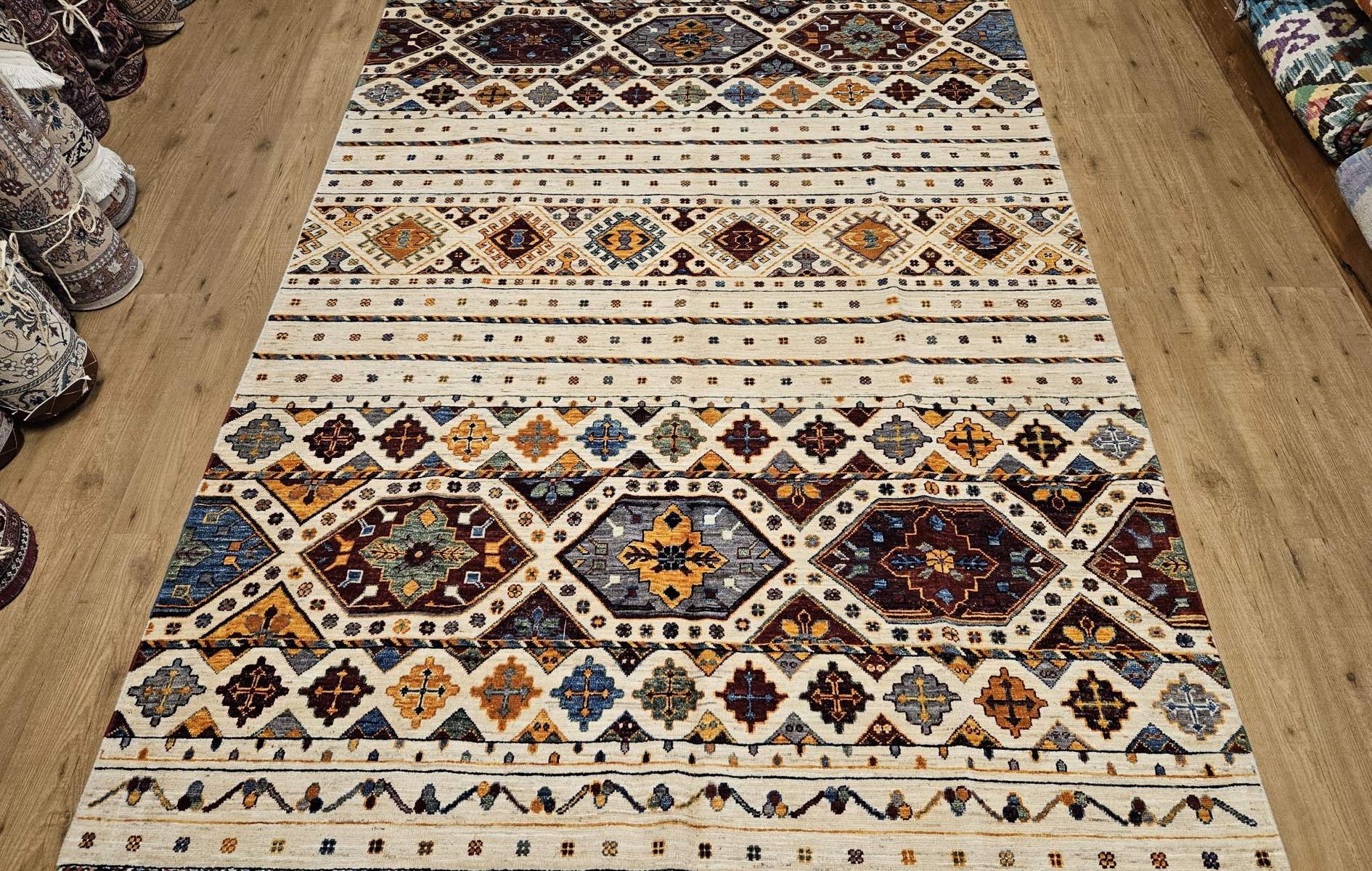 Het kleed is prachtig van kleur en heeft mooie geometrische patronen.