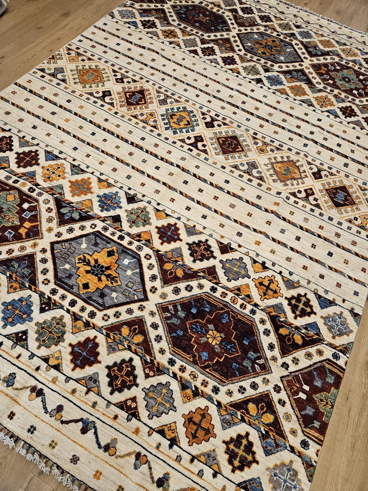 Het kleed is prachtig van kleur en heeft mooie geometrische patronen.