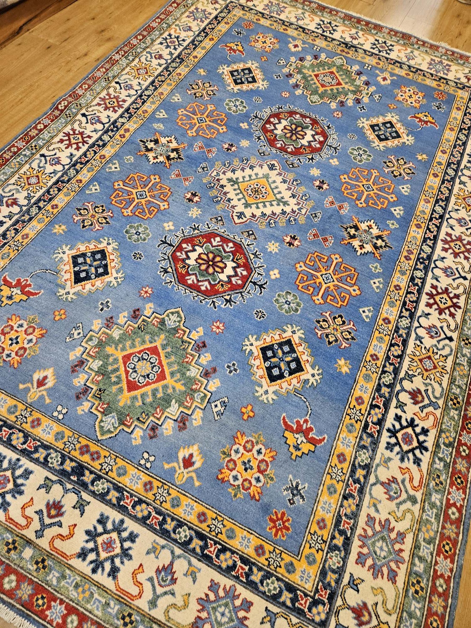 Het kleed is prachtig van kleur en de wol is zacht en soepel.