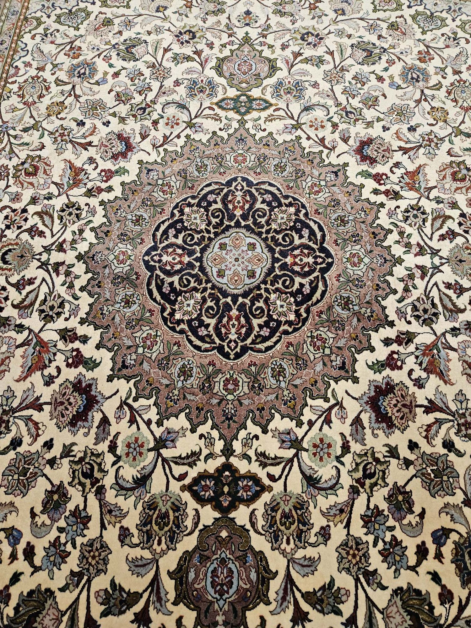 Het kleed is prachtig van kleur en zeer fijngeknoopt met zijde accenten.