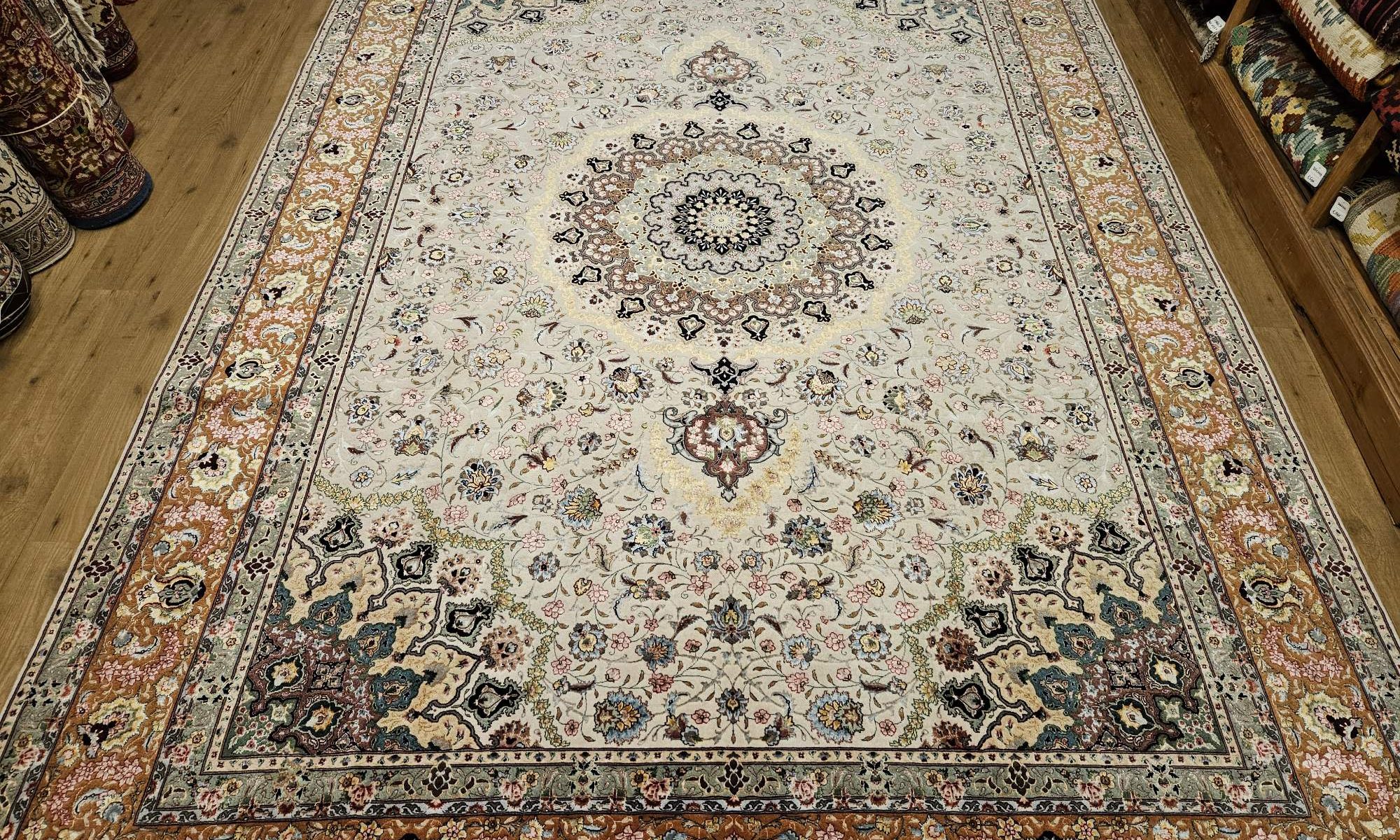 Het kleed is prachtig van kleur en zeer fijngeknoopt met veel zijde accenten.