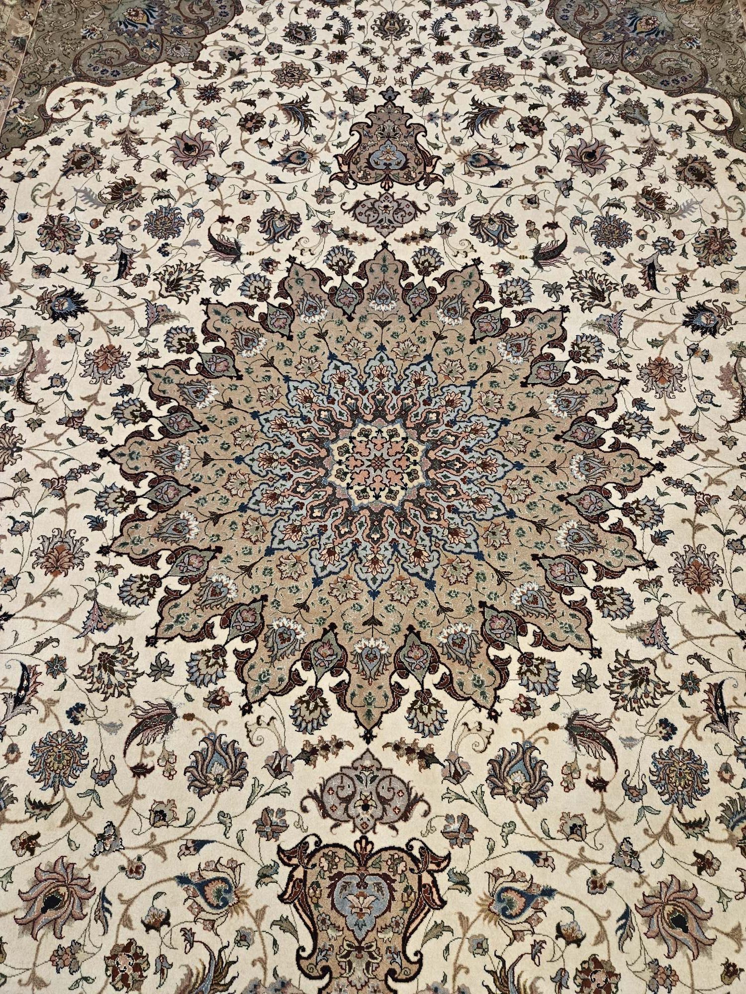 het kleed is prachtig van kleur en zeer fijngeknoopt met zijde accenten.