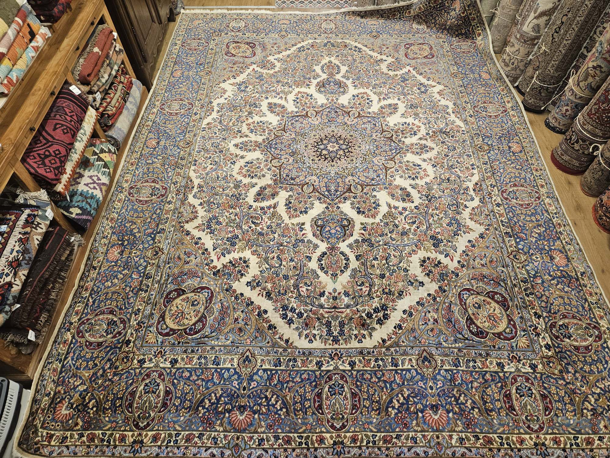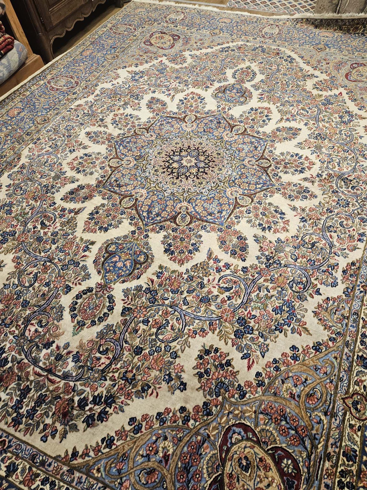 Het kleed is prachtig van kleur en fijngeknoopt.