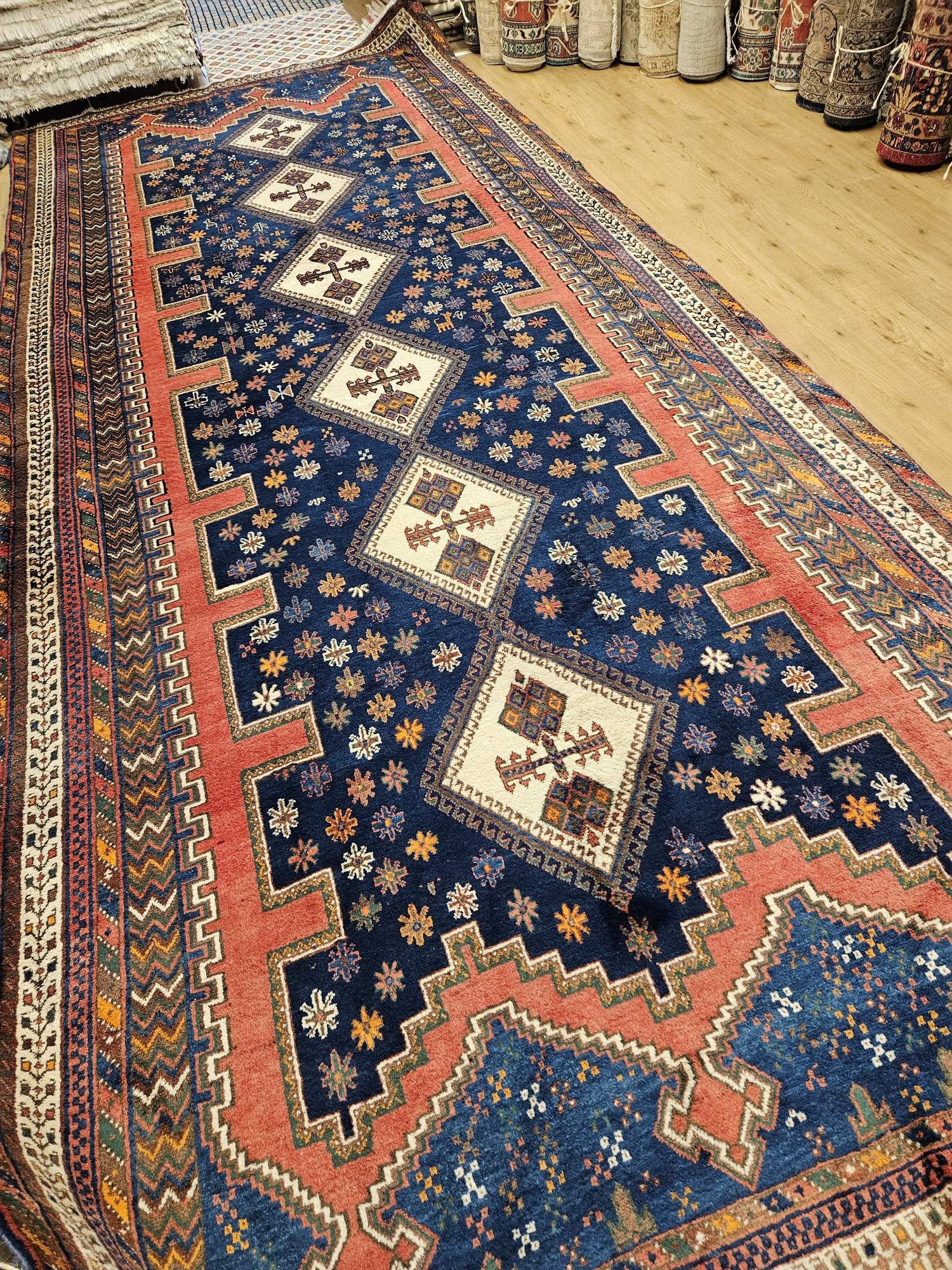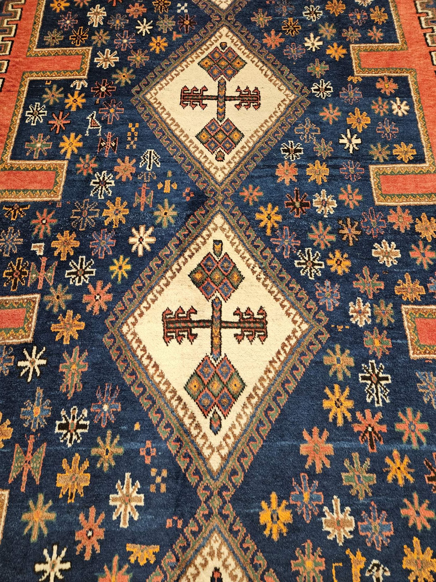 het kleed is prachtig van kleur en heeft mooie geometrische patronen.